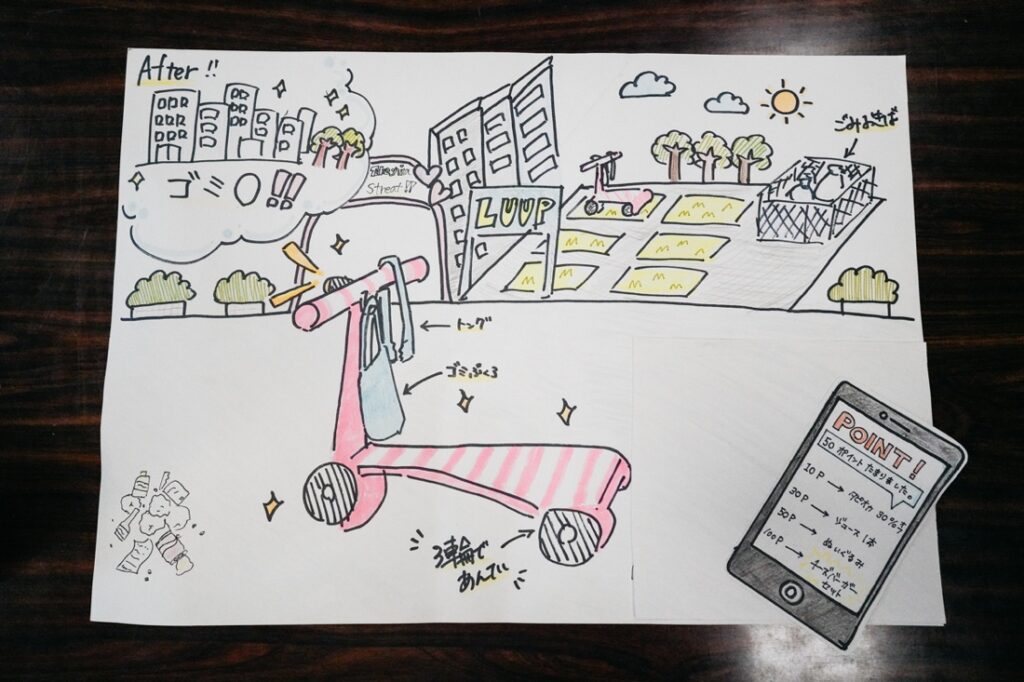 みんなが出したモビリティのアイデアを「商品化したらどんな形になるか」をイメージし、今ある電動スクーターに機能を付け足す形で考えました。電動スクーターはゴミ拾い用のトングと袋が付けられていて、街中のゴミを拾いながら移動できるようになっています。さらに、拾ったゴミの量や種類をアプリと連携させて、ポイントがたまる仕組みも考えました。