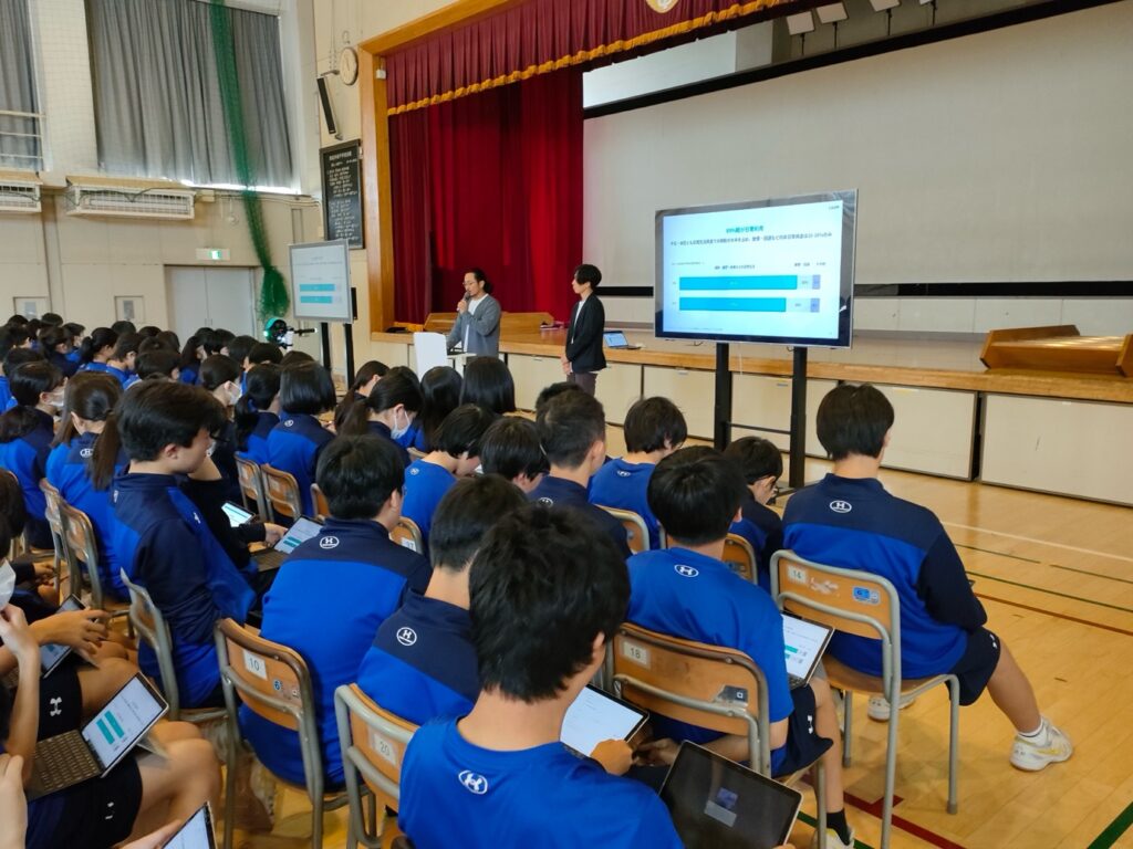 最終的には各クラスから選出された3班が、企業担当者の前で行う全体発表へと進みました。また、ちょうどその時期に地方自治体の教育委員会の方々が学校を訪れていたこともあり、そのタイミングに合わせて全体発表を実施しました。生徒たちには、「いろいろな人がいる前で発表する機会はとても貴重だよ」と伝えていたことで、発表をとても楽しみにしていましたね。