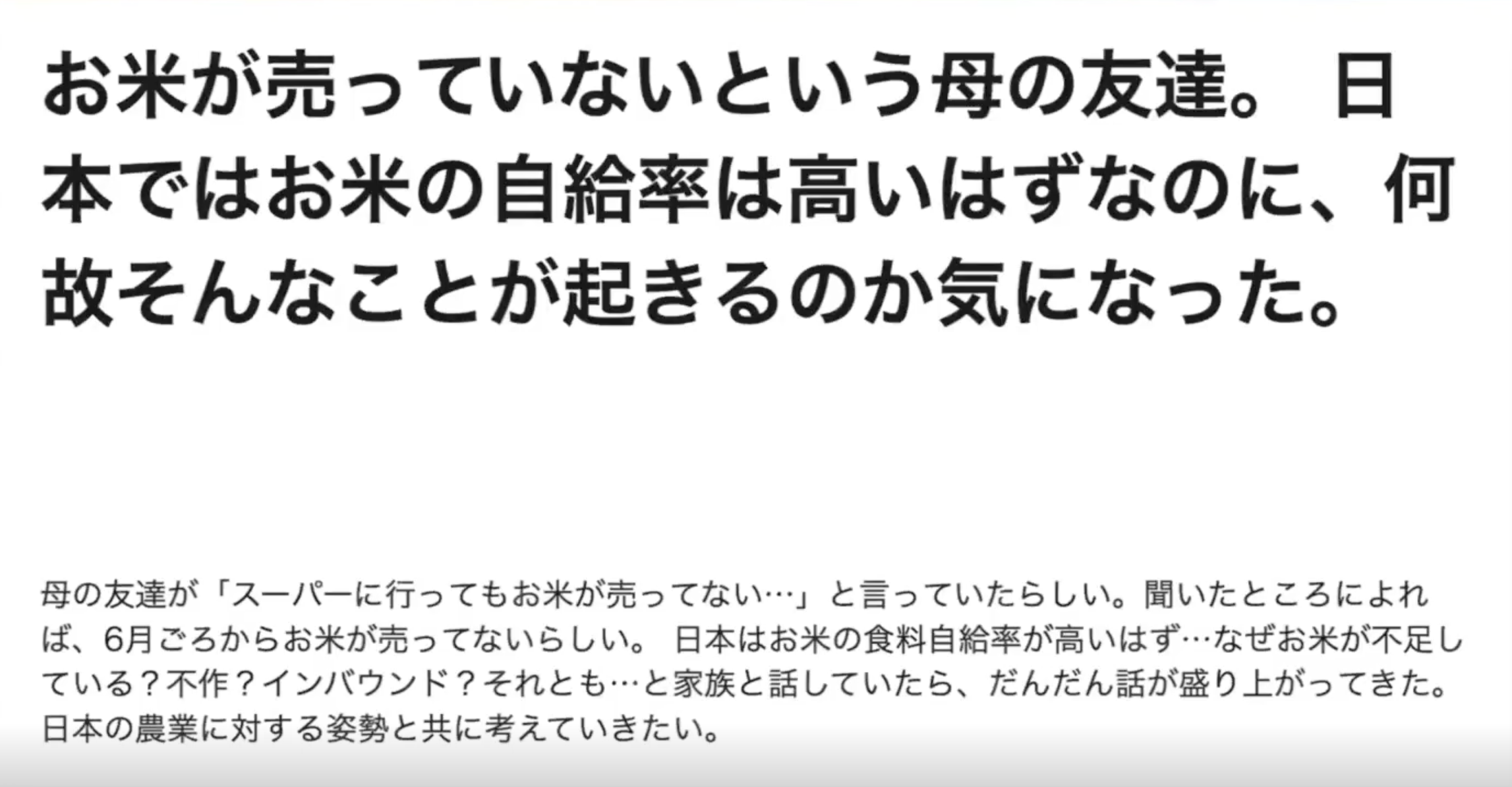 結論、令和のコメ騒動は、生産量の低下、需要の急増、対応の遅れ、流通経路の多様化、メディア社会化の影響など、多くの問題が重なって起こったといいます。また、インタビューで私たち消費者にできることを伺ったところ、どの立場の方もまずはお米をたくさん食べてほしいとおっしゃっていました。また、農家の実情を私たちが自ら調べ、日本の第一次産業が抱える問題について考えることも重要だと伺いました。