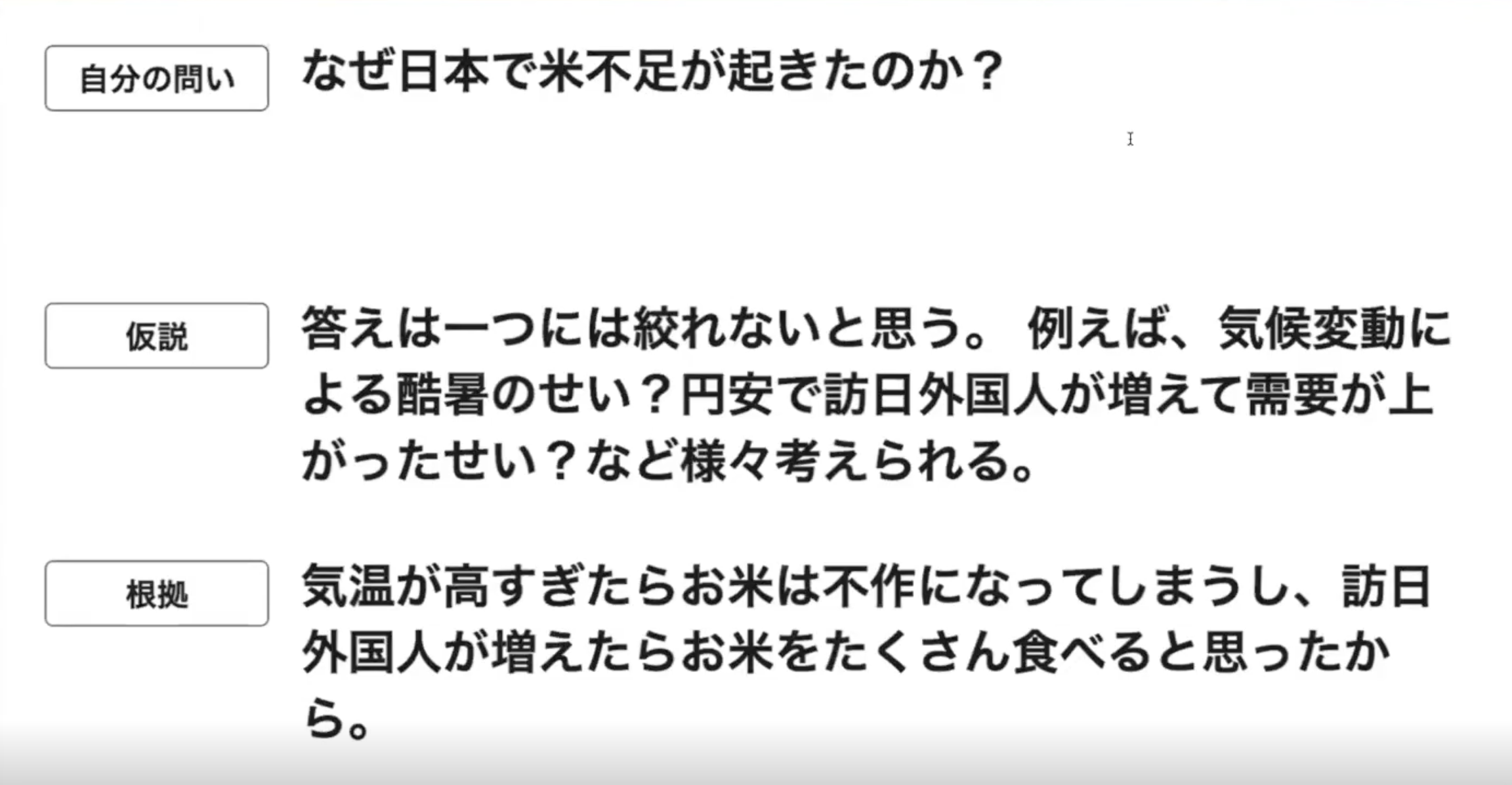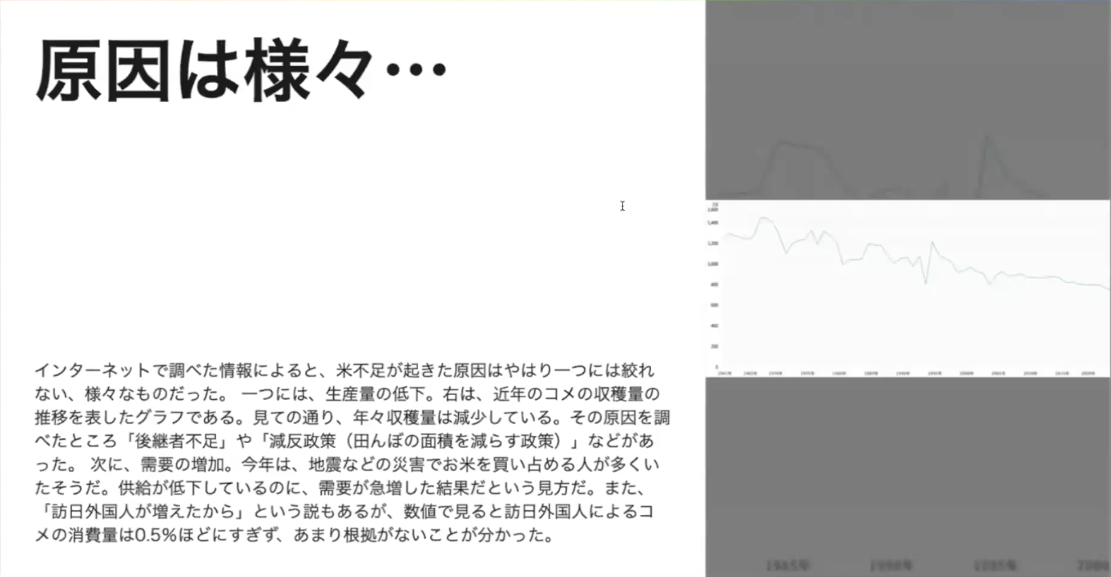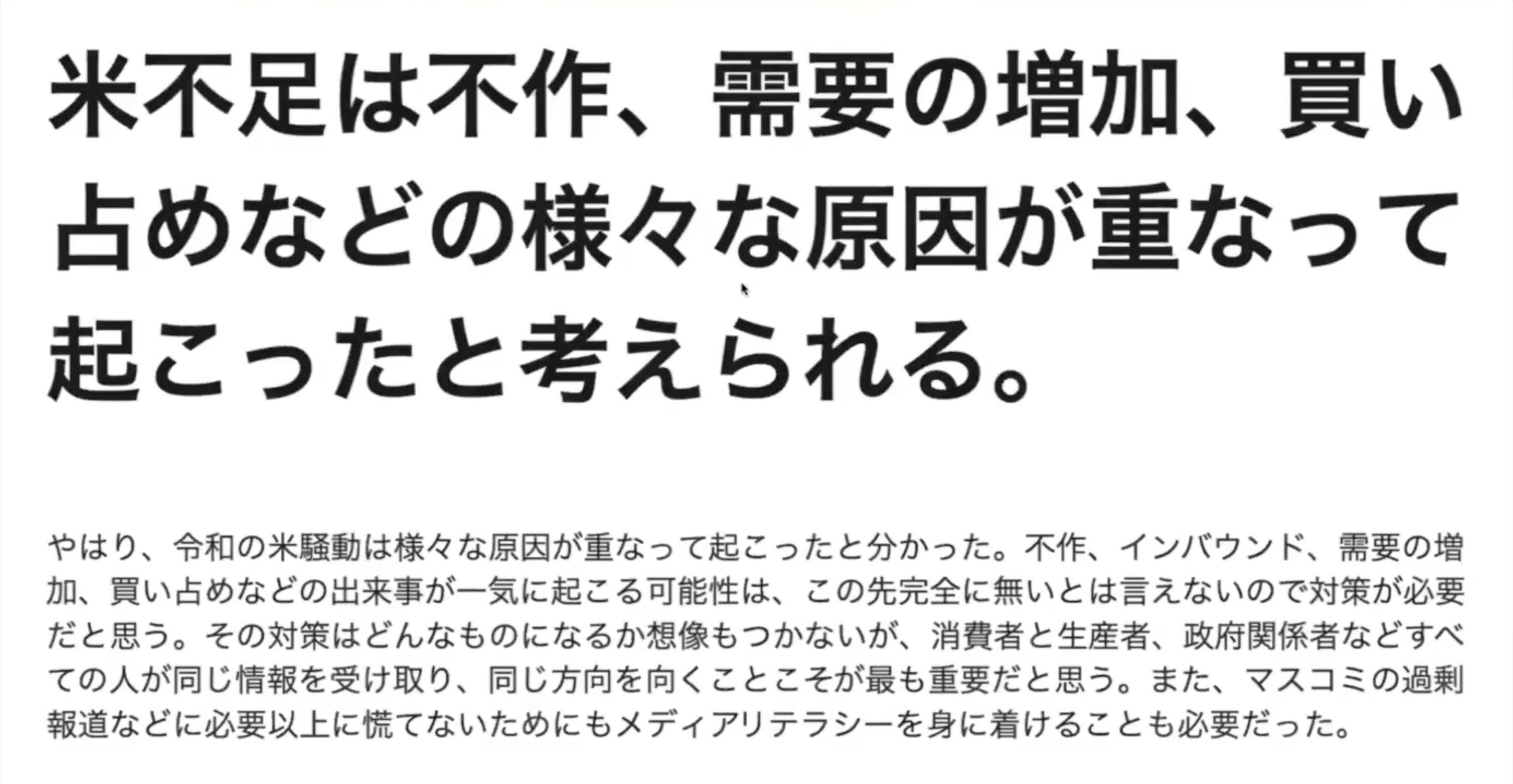 私の問いは、なぜ令和の米騒動が起きたのかです。私は母の友人からその存在を知り、探究のテーマとして一年近く追い続けました。この問いに対し、私は原因は一つには絞れないという仮説を立てました。当然といえば当然ですが、物事に問題が生じた時、原因となる事柄は複数あることが多いと思ったからです。