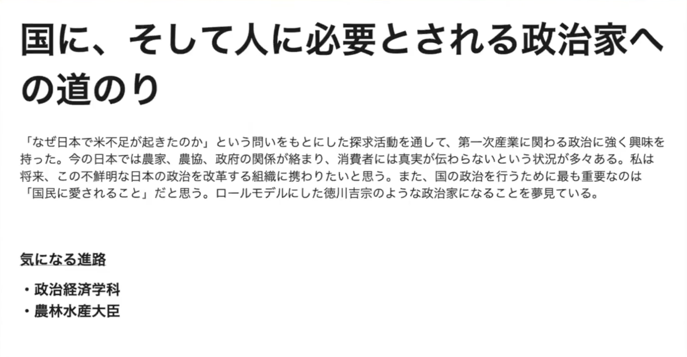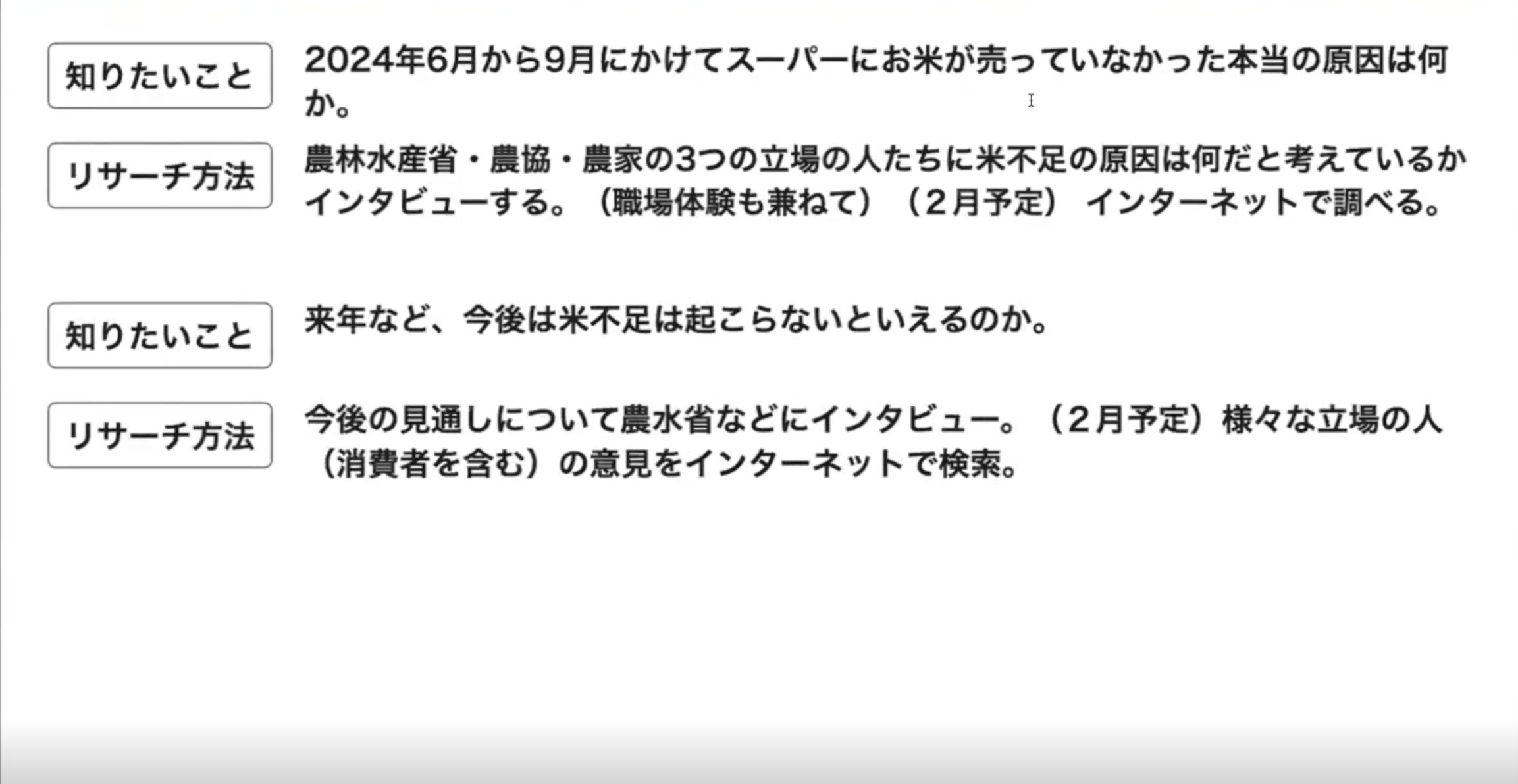学校でのクラス単位でもそうなのに、国という規模でこのようなことを実現するのは非常に難しいと思います。ですが、私は探究学習や普段の学校生活で学んでいることを活かして、まずは自分にできることから国の、そして人の役に立ちたいと思っています。加えて、今年度の探究についてですが、すでにテーマを決めています。今年度は「米の需要を増やすには」ということをテーマに、日本米の可能性についても深めていく予定です。