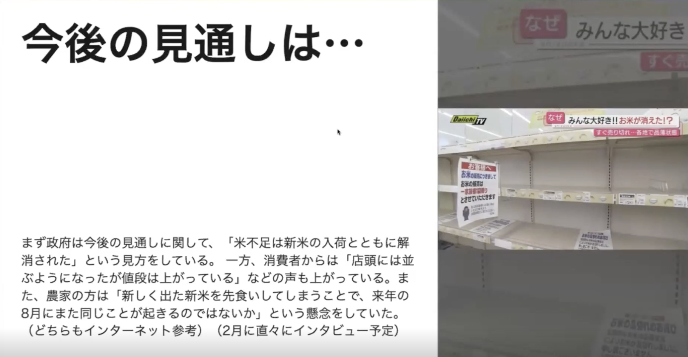 今後の見通しについてですが、2月に農水省を訪れた際は、ちょうど備蓄米を放出する制度を整えている頃で、備蓄米の放出とともに米価格高騰は収まるはずだということを伺いました。一方、JA全中や農業関係者の中には、その言葉を楽観的だと感じる声もありました。実際、年度が変わった今も米価格の高騰は収まっておらず、見通しの詰めが甘かったことも消費者からは指摘されています。以上がリサーチの結果ということになります。
